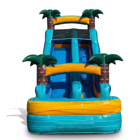 This eye-catching inflatable combines bright, cheerful colors with family-friendly design. The wet setup keeps the slide fast and exciting, while the pool at the bottom offers a safe splash zone for younger riders. The palm-tree accents add a playful coastal touch that’s perfect for summer photos and lasting memories. Our team appreciates how easy it is to set up and how quickly it becomes the centerpiece of any event.